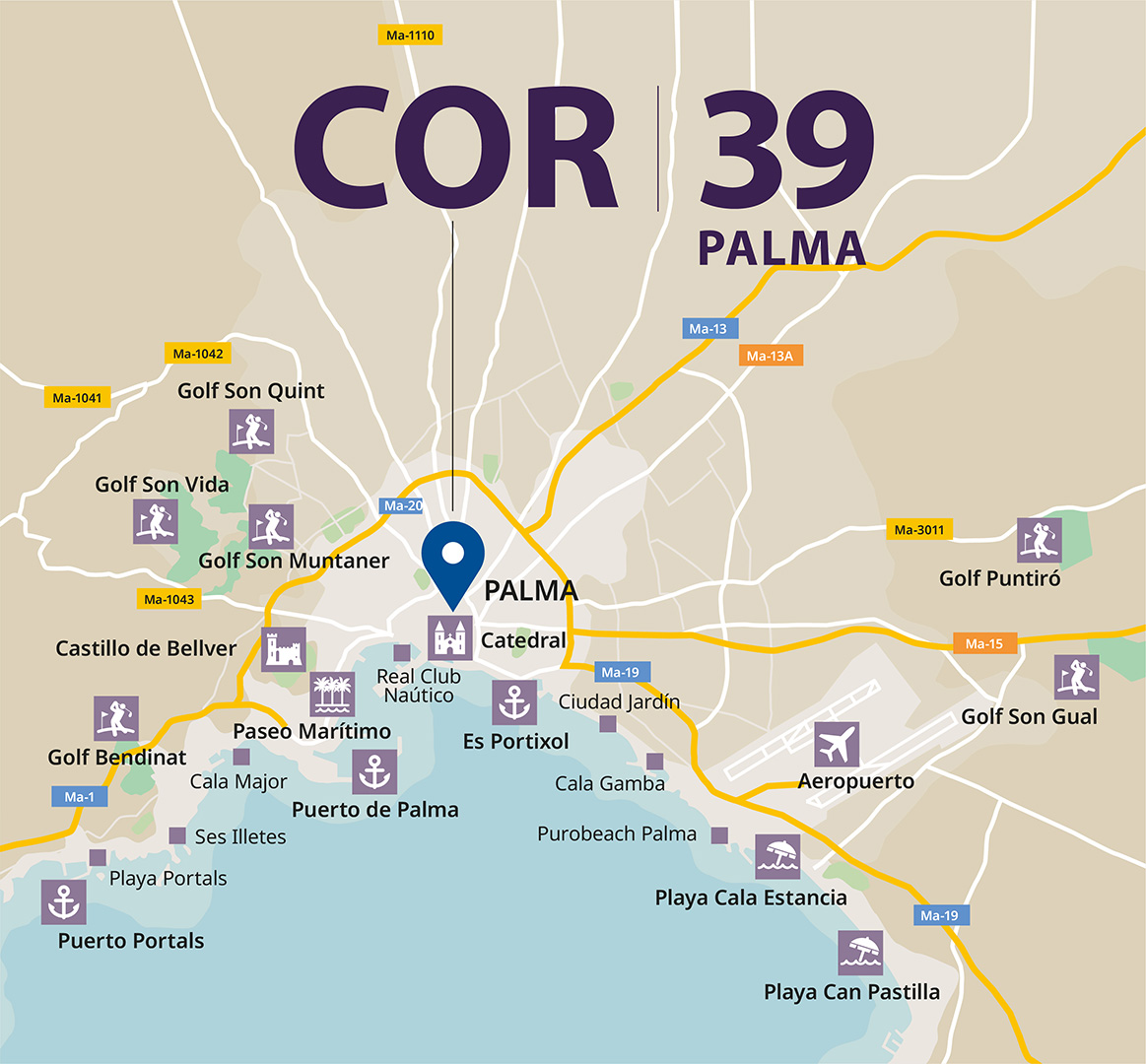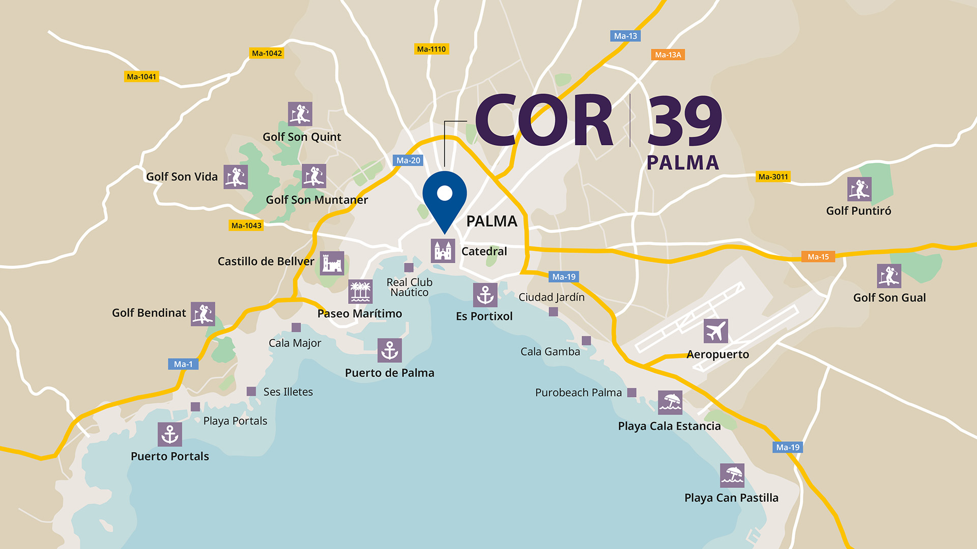 Palma de Mallorca es la capital de las Islas Baleares y uno de los destinos más atractivos del Mediterráneo. COR 39 se ubica en pleno centro de Palma, a menos de 300 metros del Casco Antiguo y de las Avenidas, dos de las zonas más emblemáticas y activas de la ciudad.