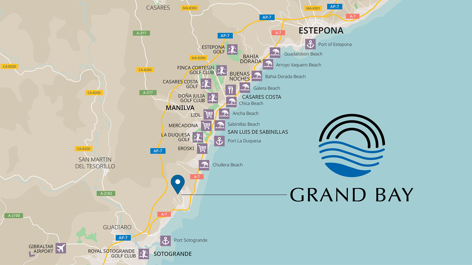 Grand Bay’s location allows you to enjoy a variety of beaches with few tourists. Nearby beaches such as Sabinillas, Alcaidesa or the emblematic Cala Sardina are naturally beautiful and enjoy spectacular surroundings with panoramic views of the Rock of Gibraltar and the North African coastline.