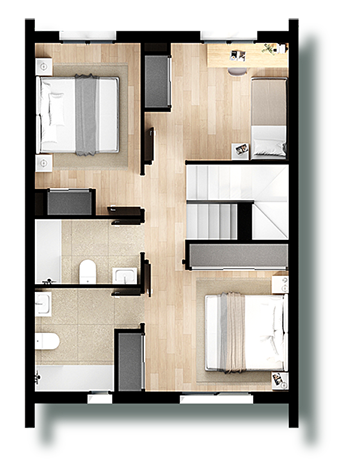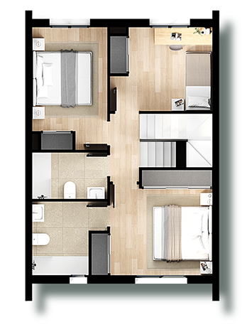 Los adosados de 3 dormitorios y 3 baños, tienen una cuidada distribución y gozan de bonitas vistas a las zonas comunes con piscina y jardines privados, al entorno natural, al skyline de Benidorm y algunas viviendas también con vistas al mar.