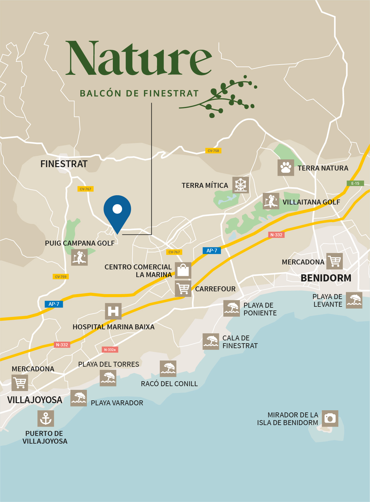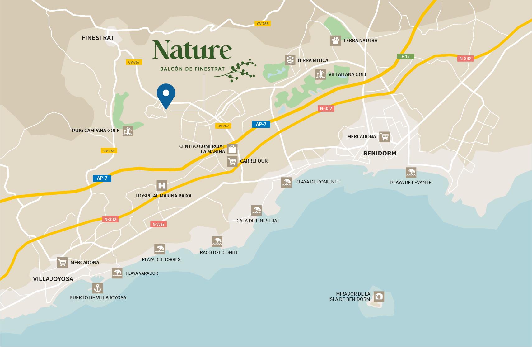 El entorno natural y su magnífica ubicación entre las poblaciones de Finestrat y Benidorm, y las amplias playas hacen que las nuevas viviendas de Nature de Taylor Wimpey España, sean una de las mejores opciones a la hora de comprar una vivienda en la Costa Blanca.